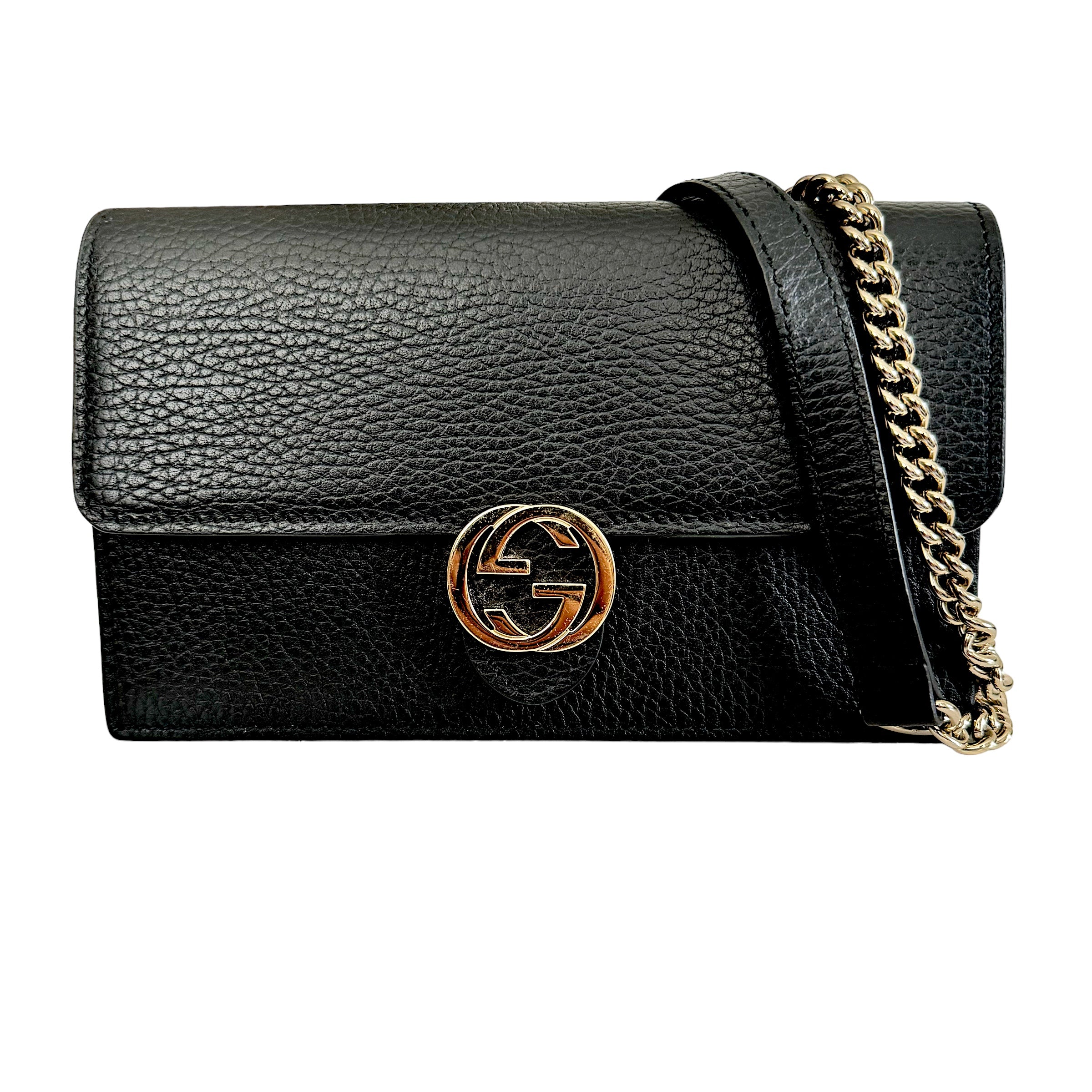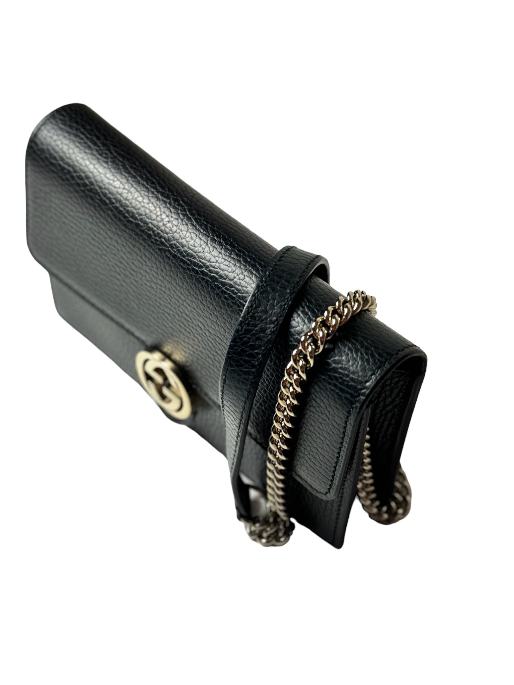 Gucci Interlocking GG Wallet On Chain Black Leather Bag Condition : Good. Exterior : This previously owned and used item is in good condition with minimal signs of use. This may include fading of material or plating and scratches. Interior : Clean, minimal signs of wear. No odor Size :W:…