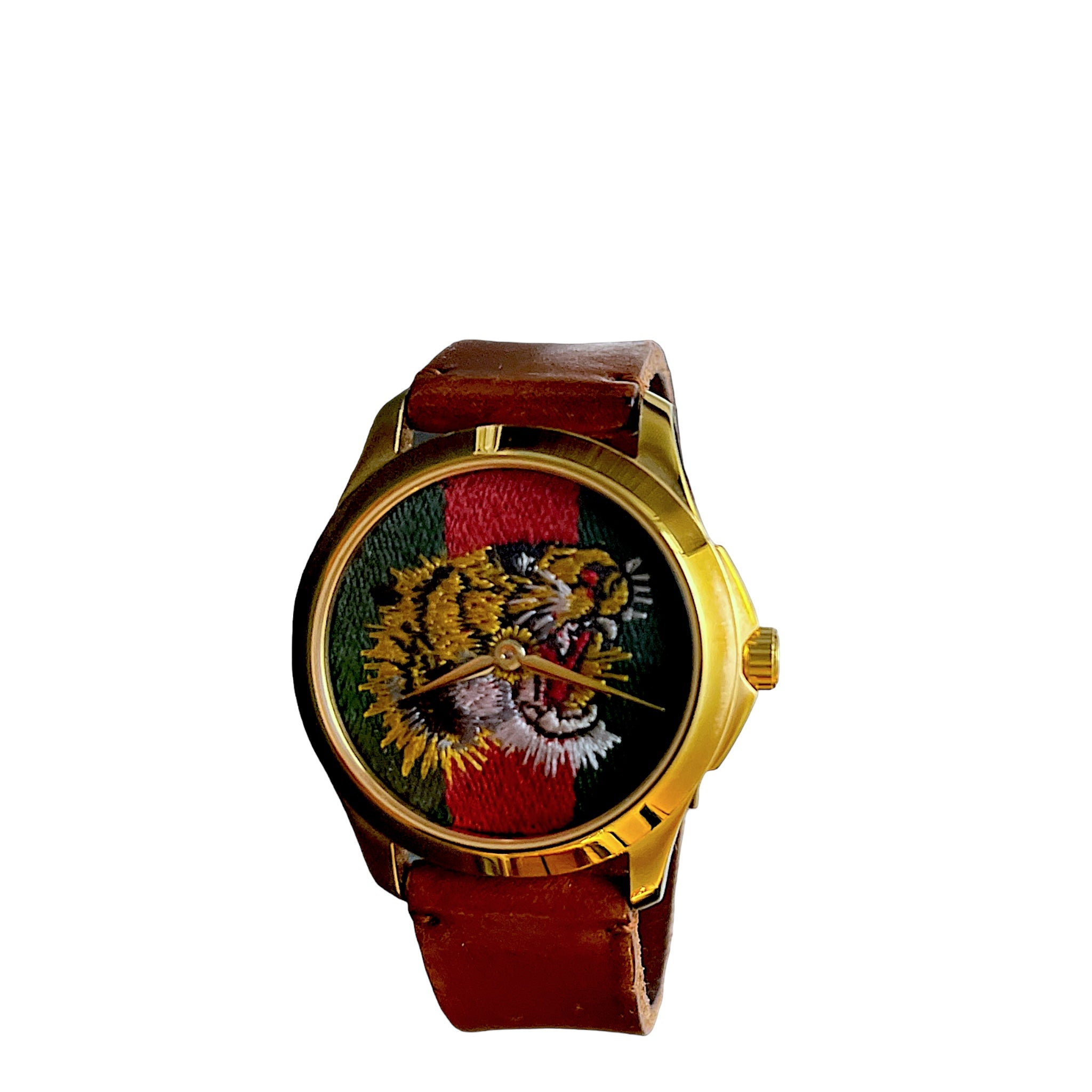 Gucci Marche Des Merveilles Tiger Green/Red Unisex Watch Condition : Good Exterior : Some signs of wear, some small scratches, discolorations to the leather trim , tiny scuffs from normal use.Hardware has som signs of wear but is kept in shiny goldenFunctional : It work properly Water resistant 5 ATM Stainless steel Swiss…