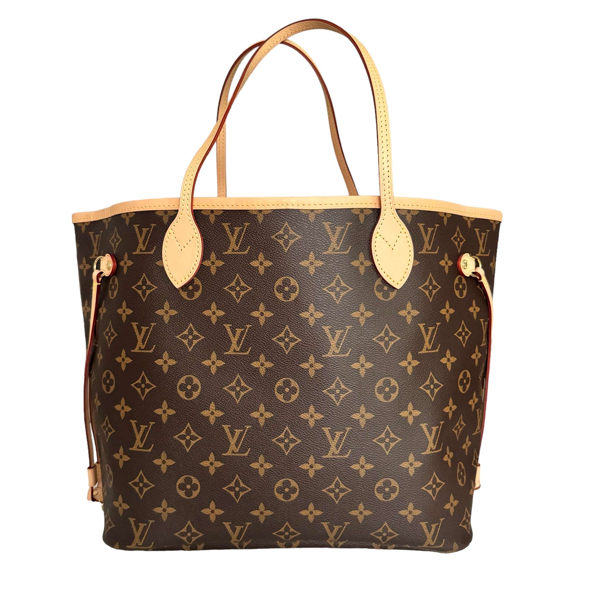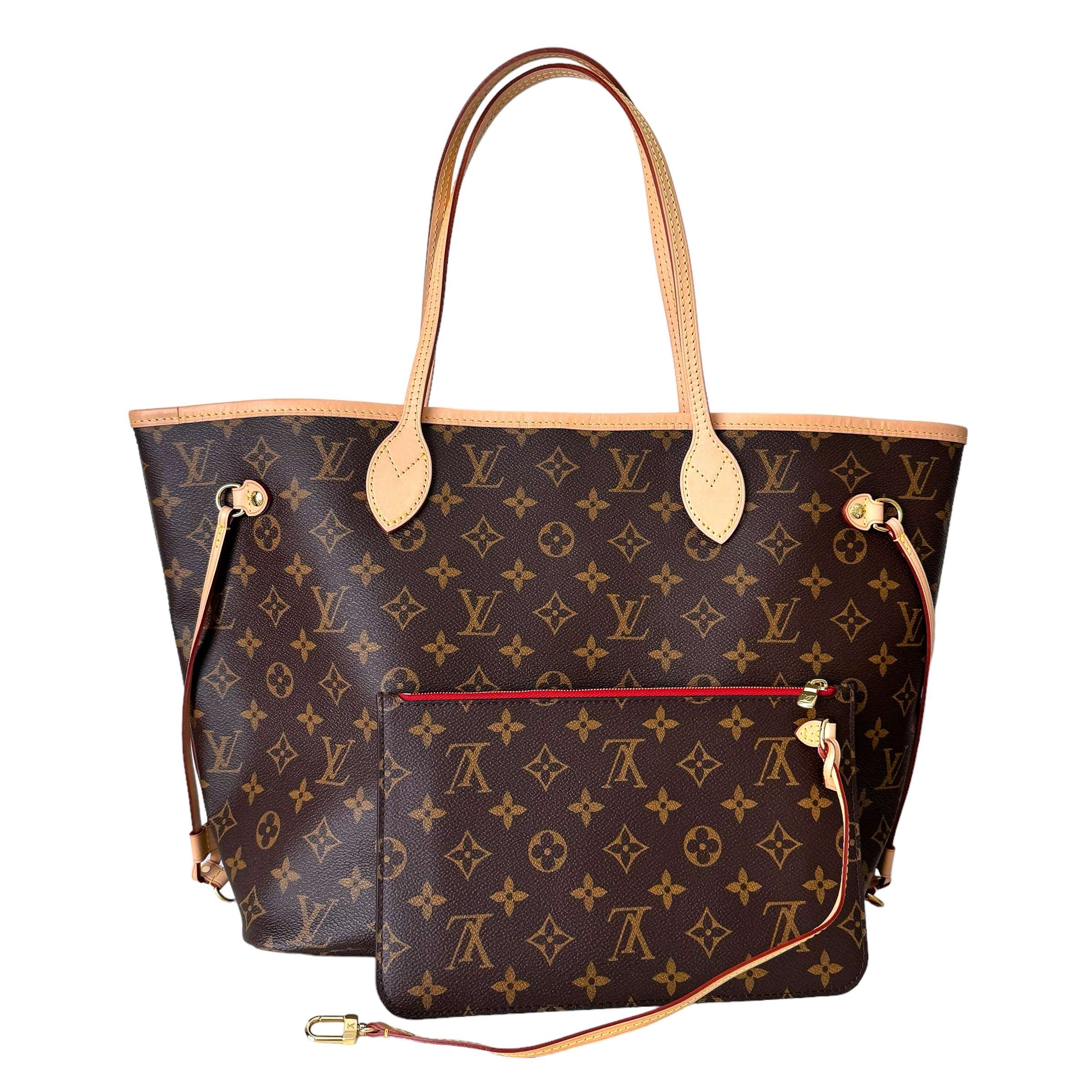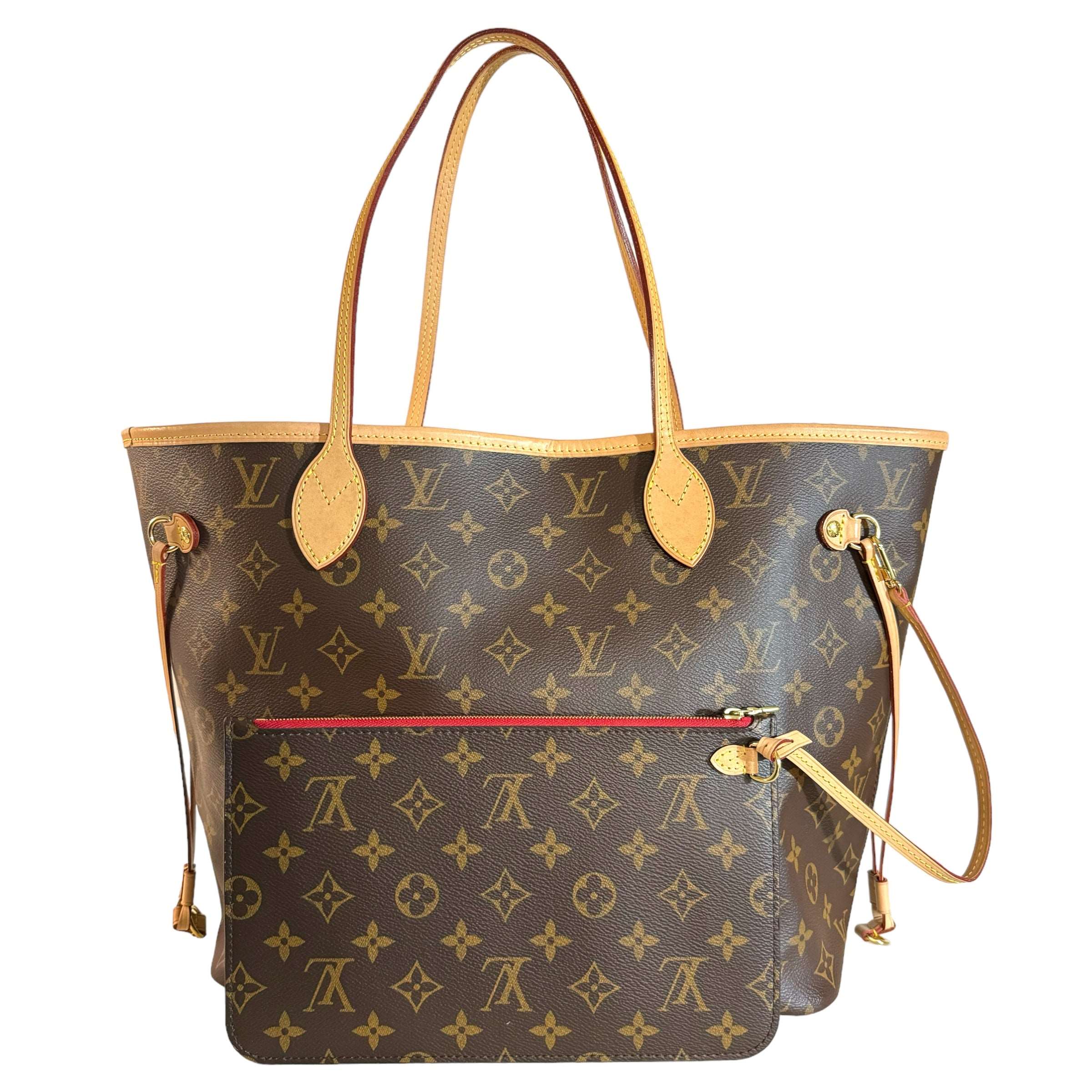 Louis Vuitton Neverfull Monogram MM Bag Cherry With Clutch Condition : Very good Exterior : Overall very good condition with small signs of wear. Slight patina to leather trim and handles. Canvas is excellent condition, no rubbing or fading on corners. The pouch has some minor signs of wear, very…
