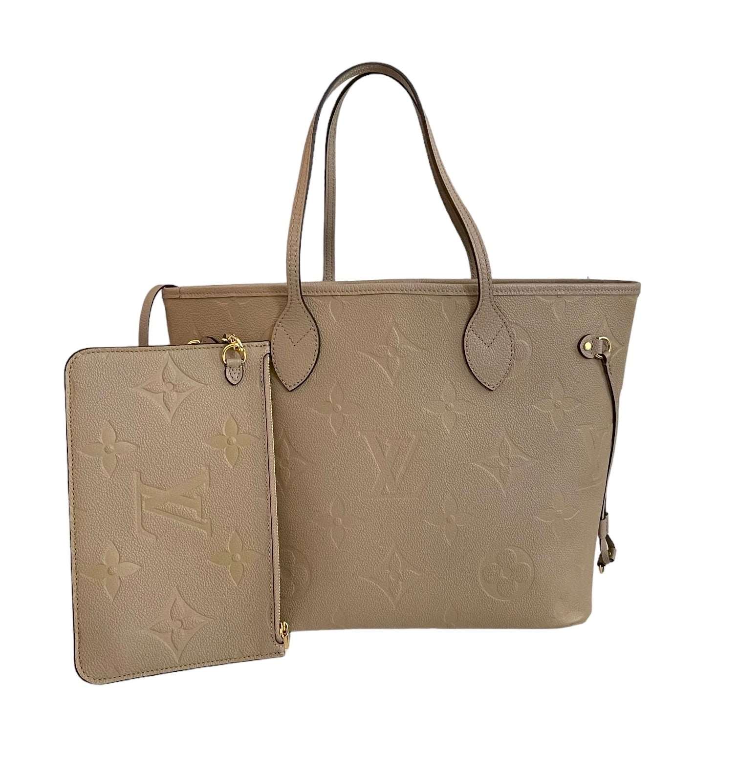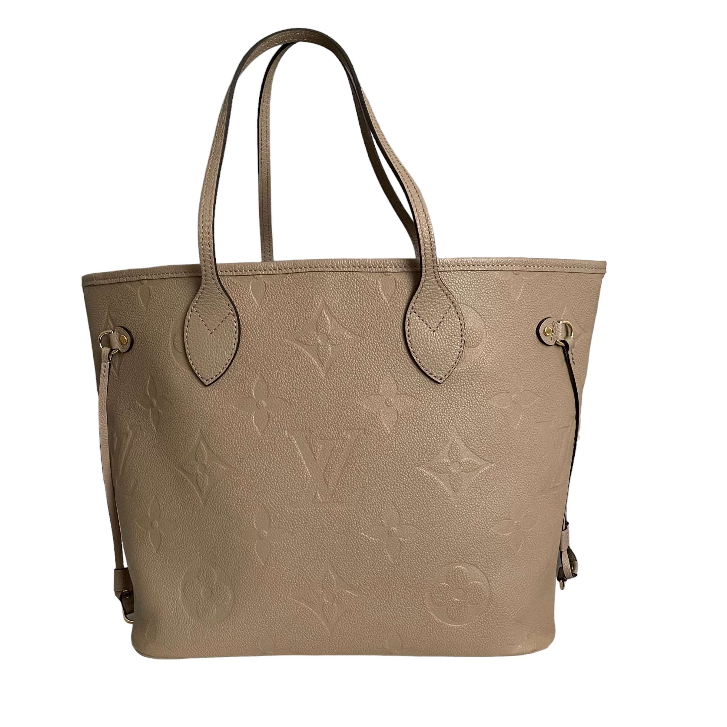 Louis Vuitton Neverfull MM Monogram Empreinte Leather in Dune colour. Condition : Very good Exterior : Beautiful leather without scratches, dryness, scuffing or fading. All the hardware kept in shiny golden . Shoulder straps has some signs of wear, Interior : Microfibre lining in dark maroon color. There is some minor…