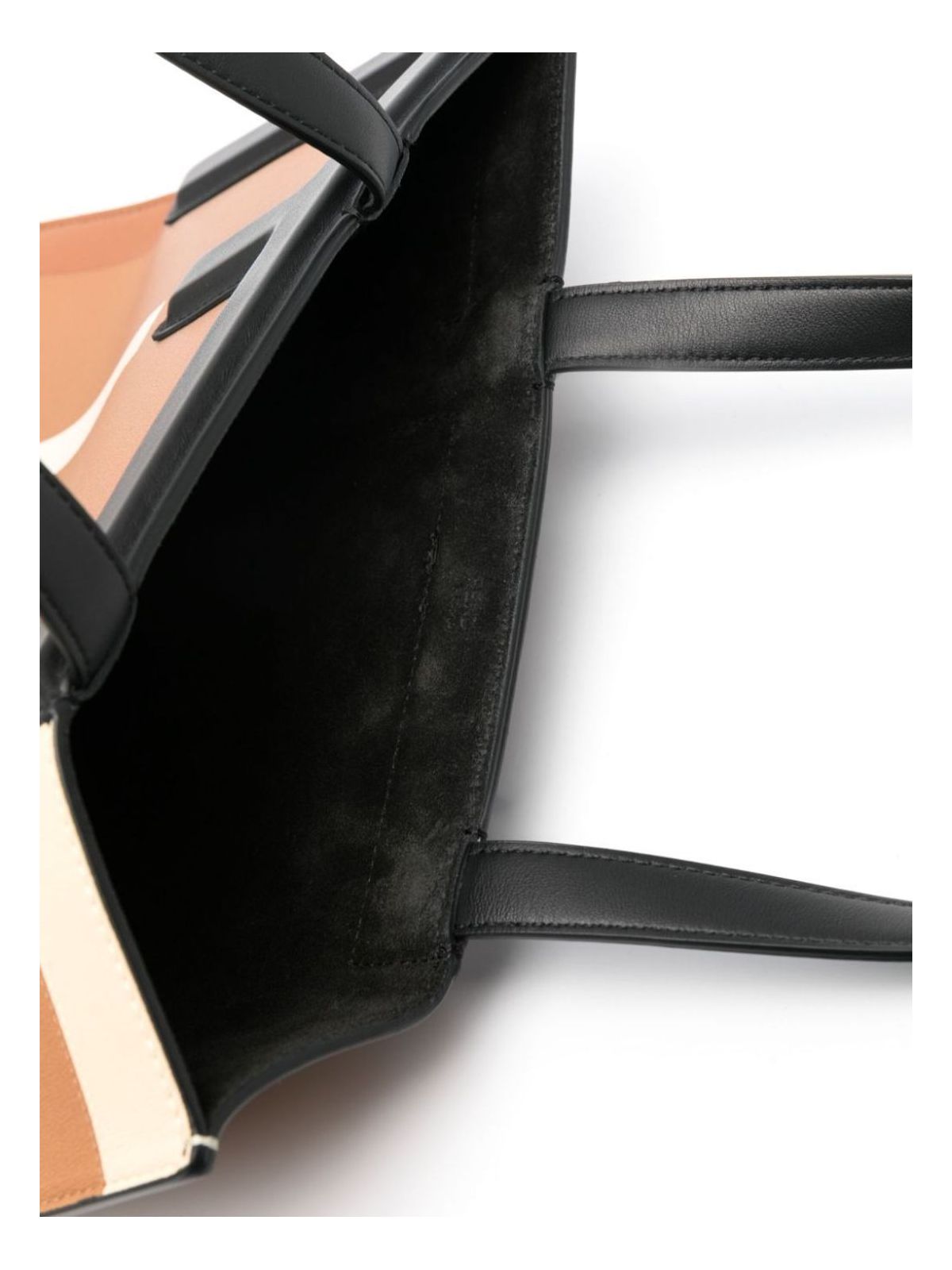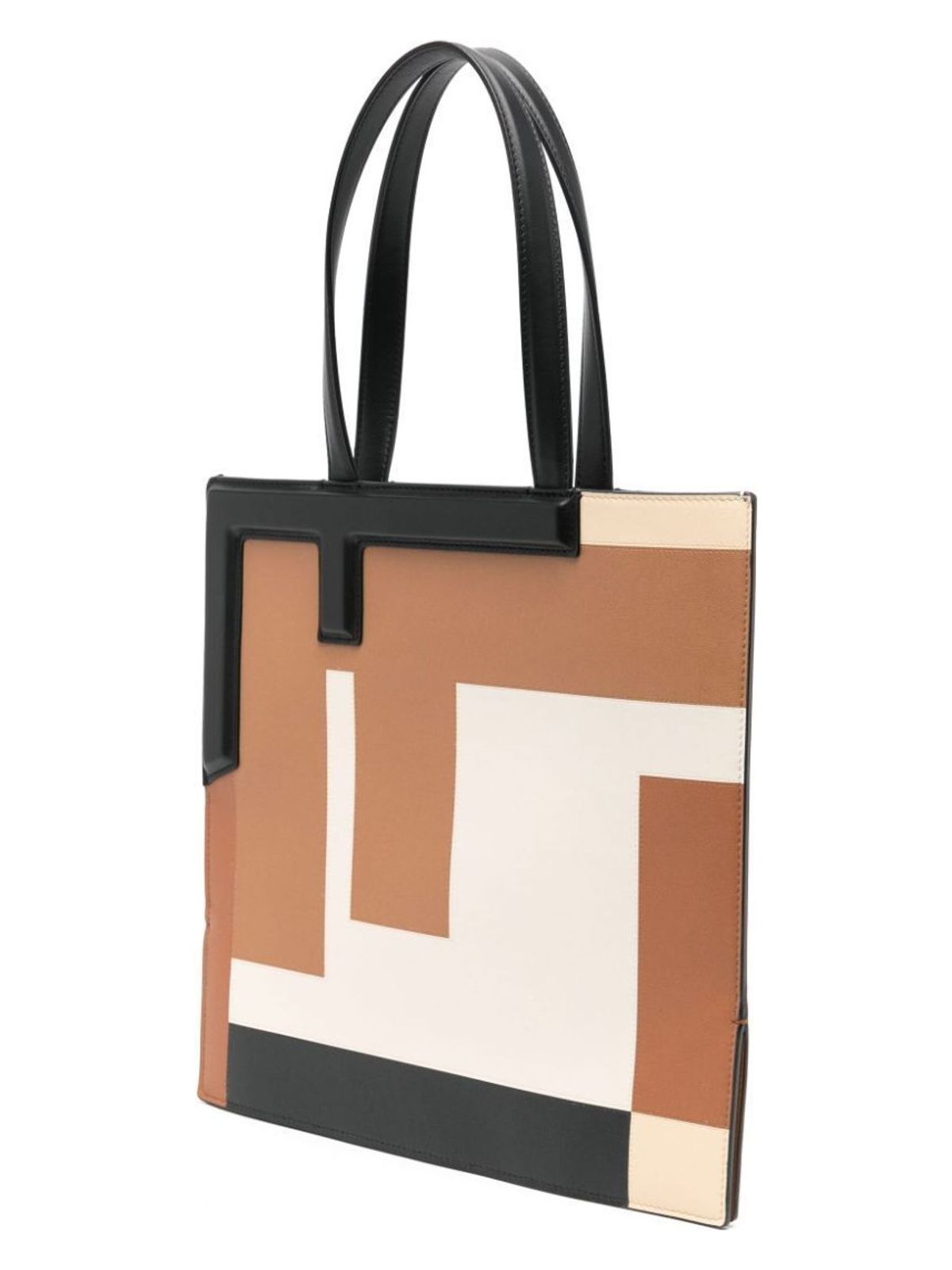 This leather medium tote bag by Fendi features an embossed FF motif in brown, white, and black, creating a unique puzzle design. The bag can be easily transformed into a clutch and boasts a spacious interior thanks to its specially designed bottom. Made in Italy, this versatile piece makes for a stylish and functional addition to any outfit.