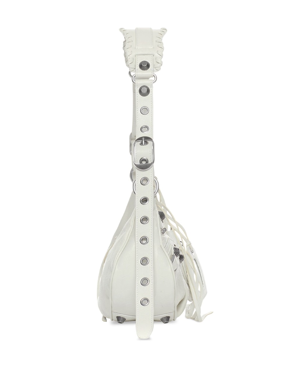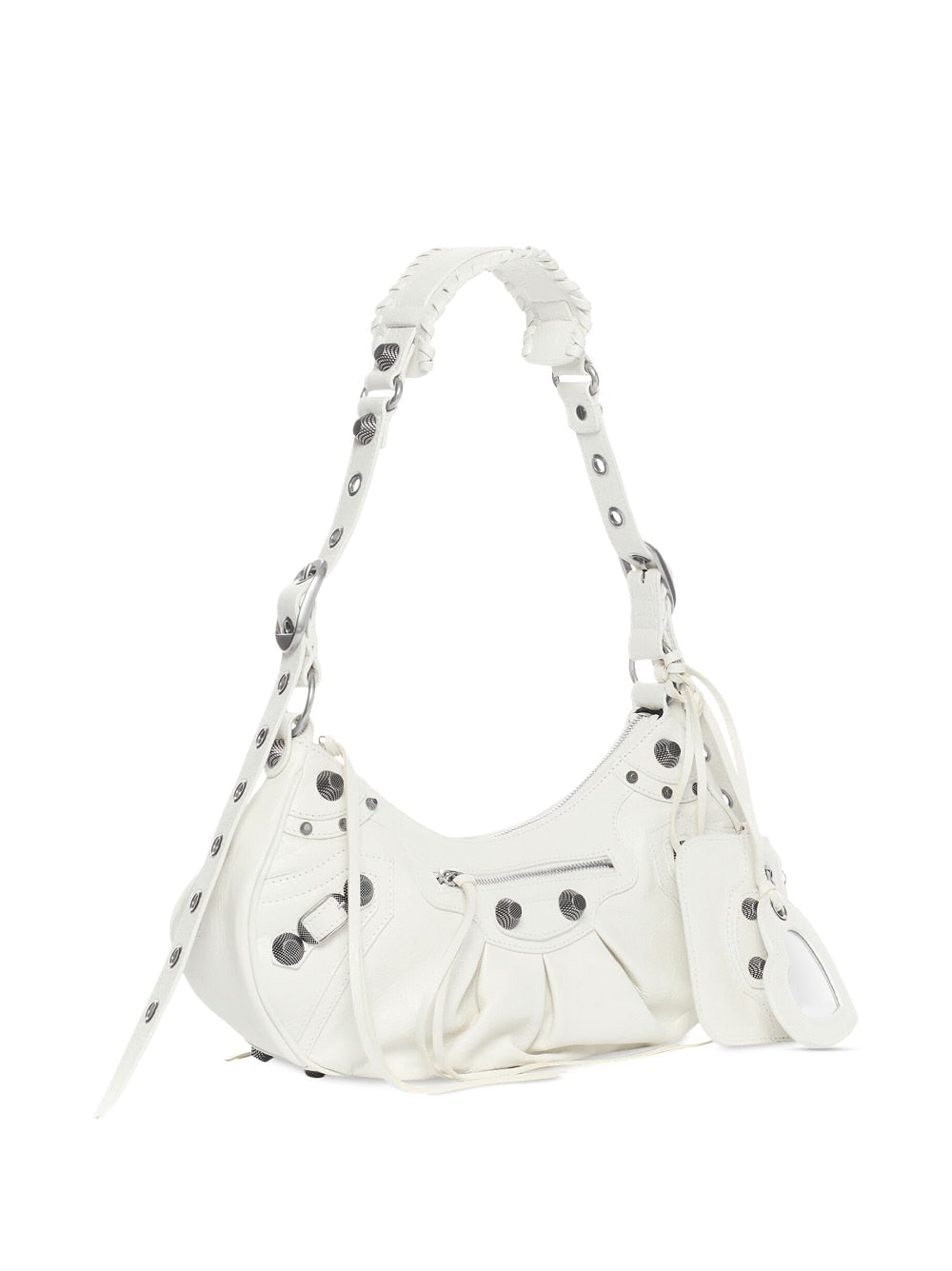 Get ready to turn heads with this stunning LE CAGOLE S Crossbody Bag. Made from luxurious soft white lambskin and adorned with silver-tone hardware, this bag is the epitome of luxury. The adjustable shoulder strap with a leather braided shoulder pad adds a touch of elegance, while the detachable zipped mini pouch and heart-shaped mirror with the Balenciaga logo offer both practicality and style. With multiple interior and exterior pockets, as well as a zip closure, this bag is as functional as it is fashionable. Whether you’re heading to a special event or just running errands, this bag is sure to elevate any outfit.