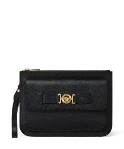 • Textured black goatskin with a chic Medusa plaque