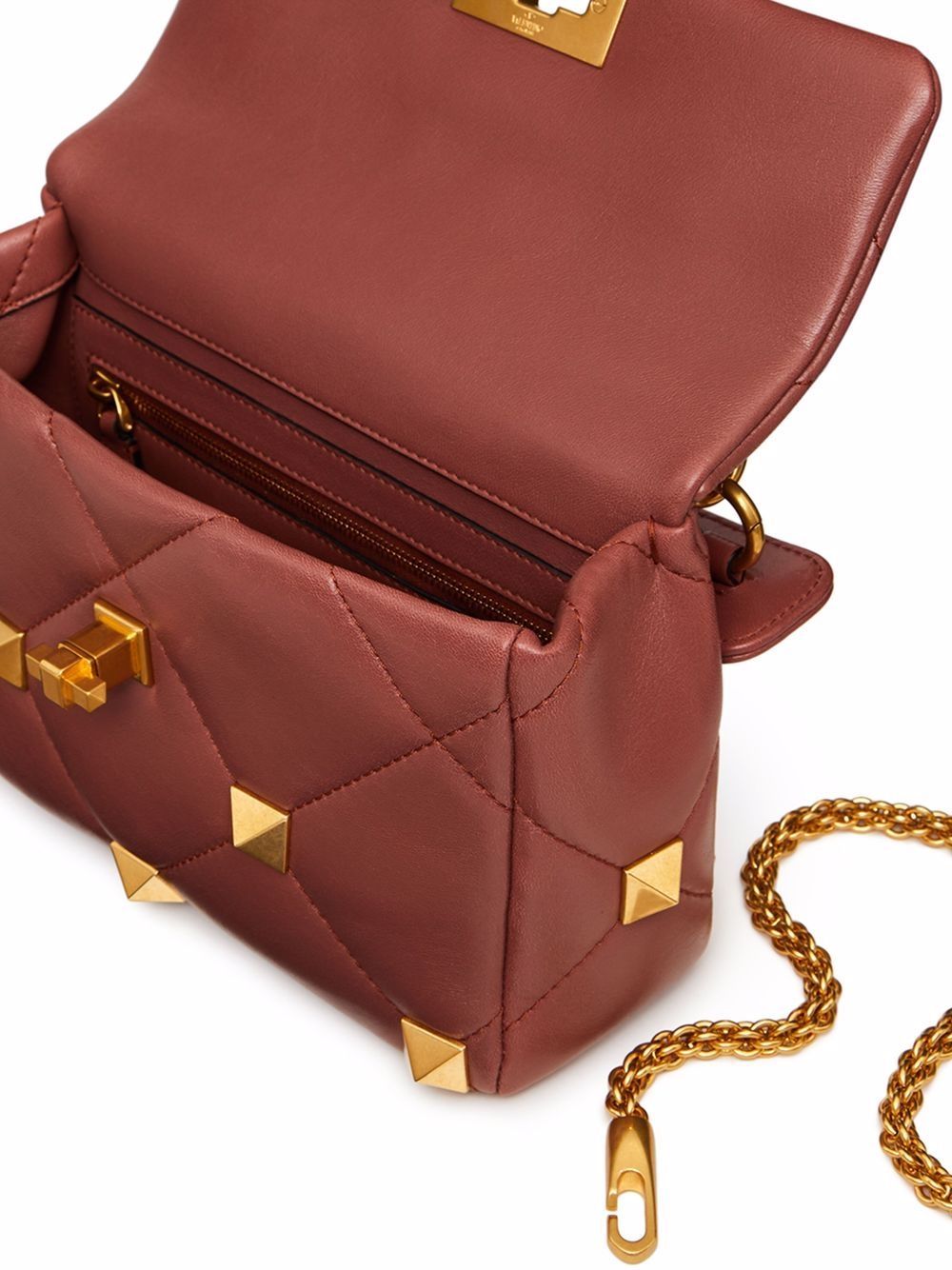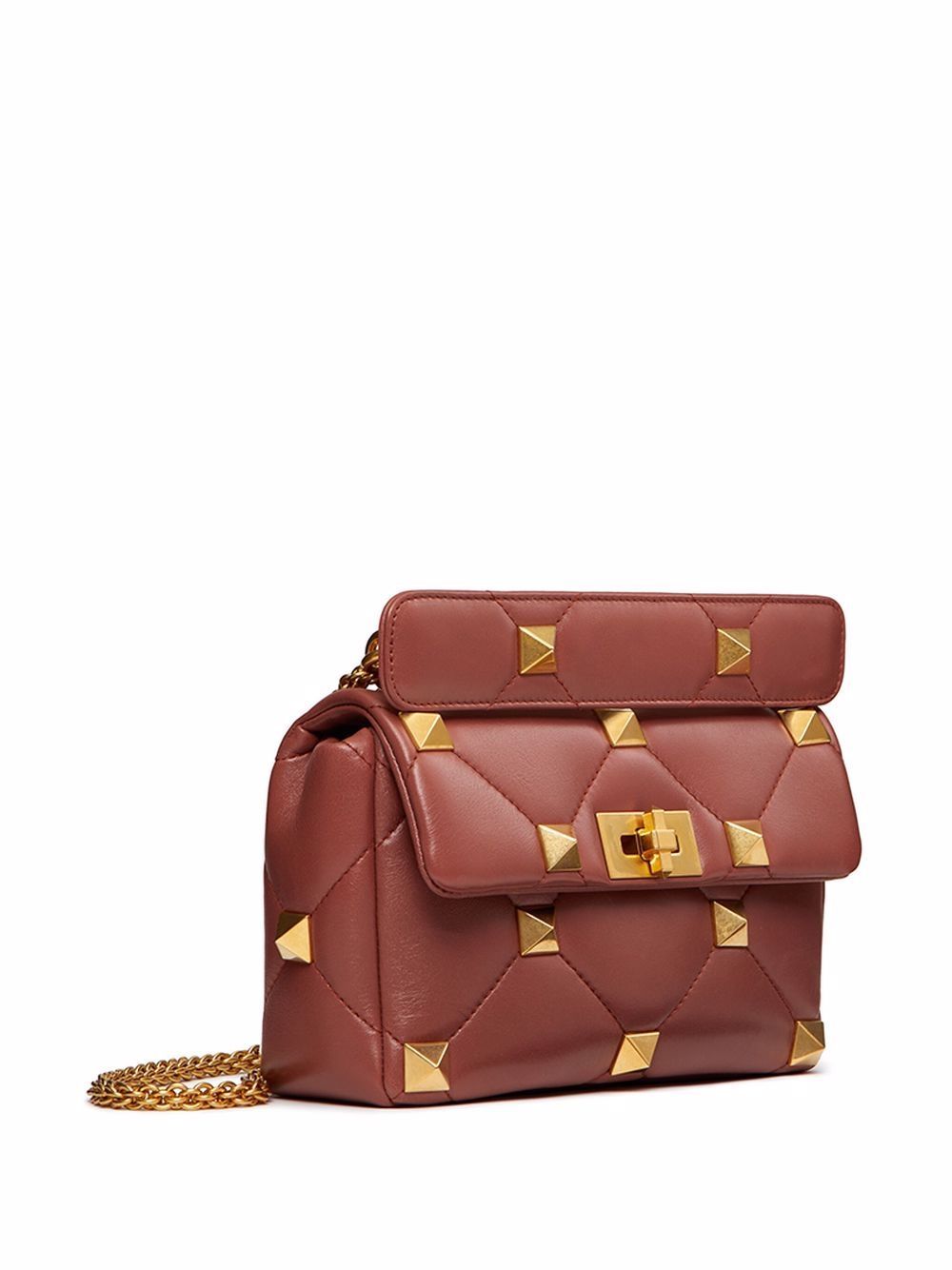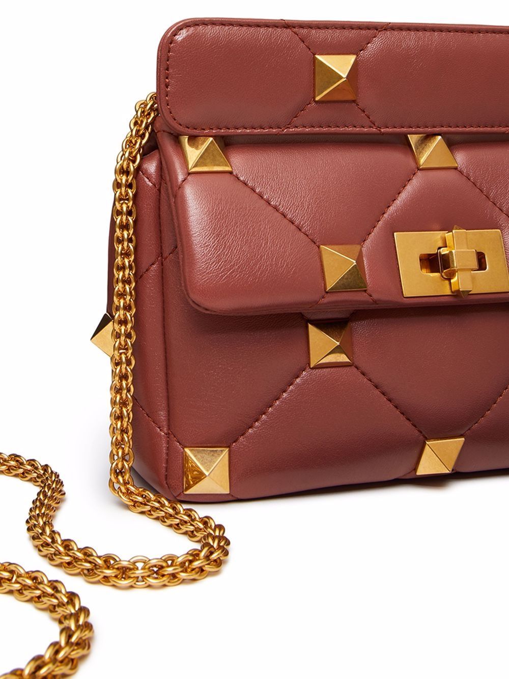 Step into the world of high fashion with this beautifully crafted shoulder bag. Made from premium lambskin leather, its stylish design and gingerbread hue make it a must-have accessory. Pair it with your favorite outfit and let its Roman studs add a touch of elegance and sophistication to your look.